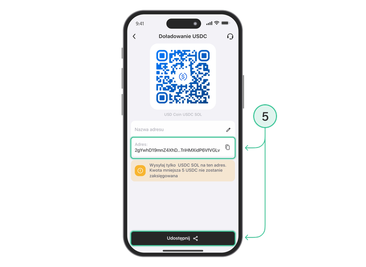 5. Adres kryptowaluty pojawi się w otwartym menu: można go skopiować lub wysłać za pośrednictwem komunikatora w postaci kodu QR za pomocą przycisku "Udostępnij".